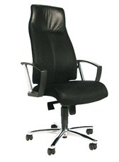 Piètement en acier chromé. Accoudoirs en polypropylène noirs/chromés. Garni de mousse 100% polyuréthane 30 kg/m3 (assise) et 20 kg/m3 (dossier). Dossier et assise revêtus tissu 100%. Têtière du dossier en croûte de cuir pigmentée noir. Système basculant décentré, réglage en hauteur par vérin gaz, blocage en différentes positions et réglable en intensité. Conforme à la norme feu BS 5852. L : 48 cm - H : 118 cm - P: 46 cm